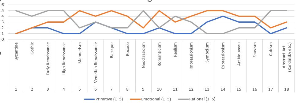 Using CoPilot, I asked, based on a summary document describing different artistic periods in time, to what extent each art period is defined by primitive, emotional or rational ways of thinking and to give a score on 5 for each way of thinking in each period, relatively over all 18 periods and on average.
