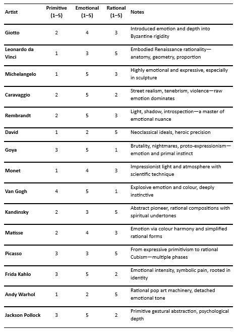 Like for periods in art history, can we map individual artists across the primitive, emotional, and rational spectrum to better understand their artistic mindset and how they reflect or reshape historical tendencies? It's like creating a psychological fingerprint for each artist through their work, this was the outcome CoPilot provided …