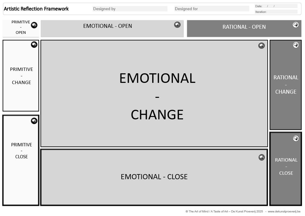 This framework can be a guidance tool for artistic self-reflection, to get deeper insights in and grip on personal artistic DNA and environments, but also to allow understanding and following artist's thoughts and visions and align between and within artistic individuals or groups.